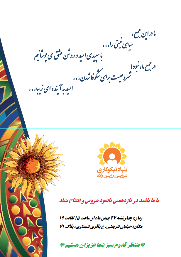 11 فوریه اخبار و گزارشات یازدهمین سال افتتاح بنیاد مارس 3, 2025 توسط bonyad_admin با ما باشید در یازدهمین یادبود شروین و افتتاح بنیاد زمان: چهارشنبه 27 بهمن ماه از ساعت 15 لغایت 19 در محل بنیاد منتظر حضور گرم شما عز... ادامه مطلب