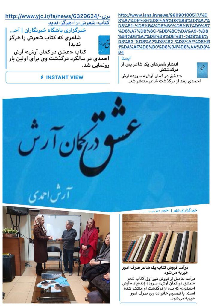 15 ژانویه اخبار و گزارشات رونمایی از کتاب عشق در کمان آرش مارس 2, 2025 توسط bonyad_admin رونمايي از كتاب آرش احمدي در بنياد نيكوكاري شروين روبن زاده http://www.yjc.ir/…/news/63…/شاعری-که-کتاب-شعرش-را-هرگز-ندید @bonyadesherv... ادامه مطلب